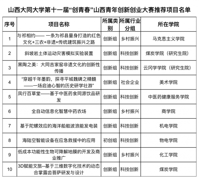 根据《关于举办第十一届“创青春”山西青年创新创业大赛的通知》(晋团联发〔2024〕17 号)精神,大赛组委严格依据大赛评分标准打分排序,经全方位考察,决定推荐项目如下: